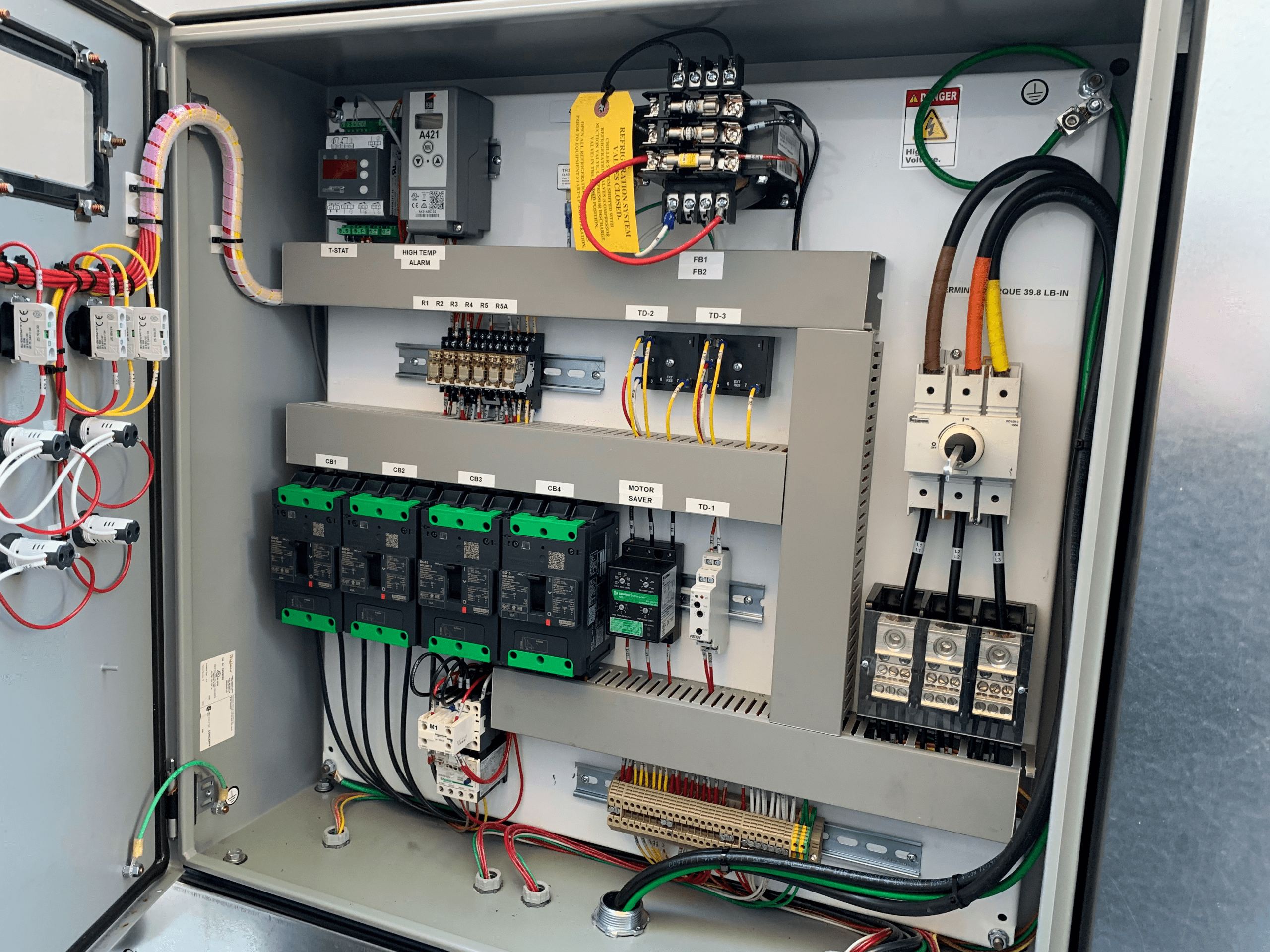 This brewery chiller system features a high efficient chiller evaporator, stainless steel glycol pumps including an internal chiller evaporator pump and a dedicated VFD glycol process pump, and a 200 gallon insulated glycol tank to maintain a constant 28F glycol temperature using dual redundant 7HP compressors.